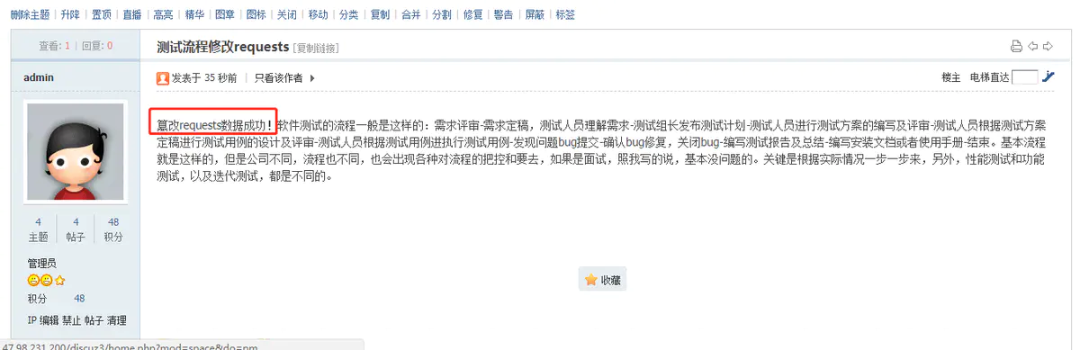 论坛中查看到刚刚发布的帖子内容如下,就被成功篡改了 requests:
