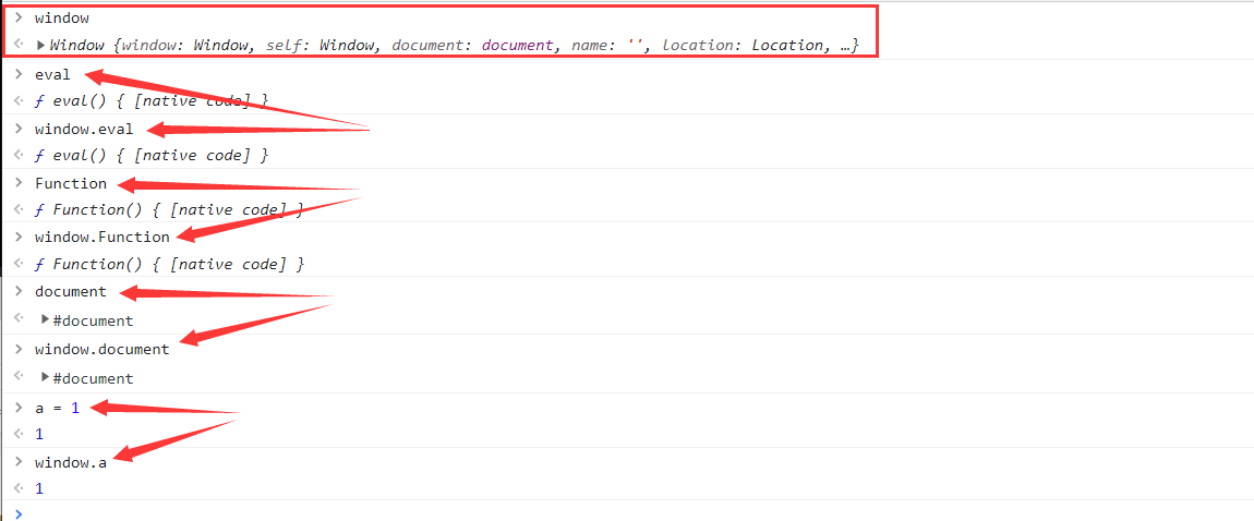 首先 JS 代码还没运行的时候,JS 环境里已经有一个 window 对象了。可以说,window 是整个浏览器中最底层的对象。很多时候我们都会把 window 对象省略,因为它是源头,例如 eval等价于window.eval 等: